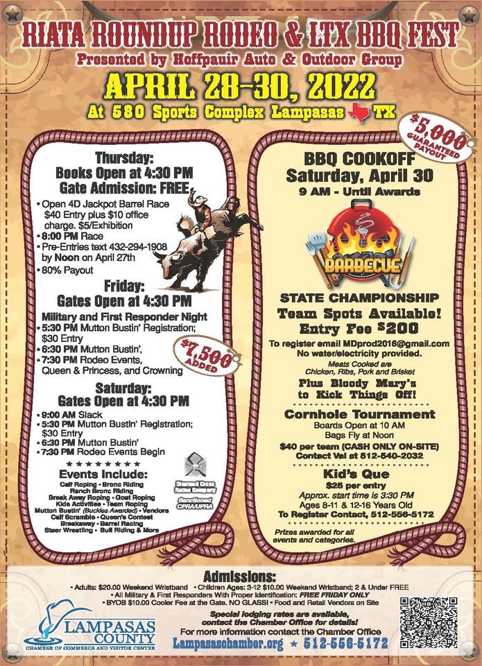 Riata Roundup Rodeo, Lampasas, TX, 4/264/28 Go Country Events, The lampasas county chamber of commerce and visitor center is excited to be hosting the 2025 riata roundup rodeo & ltx bbq fest presented by hoffpauir. Riata rodeo & ltx bbq fest presented by hoffpauir group.